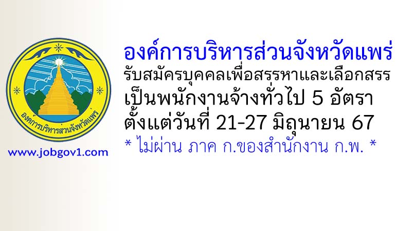 องค์การบริหารส่วนจังหวัดแพร่ รับสมัครบุคคลเพื่อสรรหาและเลือกสรรเป็นพนักงานจ้างทั่วไป 5 อัตรา ตั้งแต่วันที่ 21-27 มิถุนายน 2567