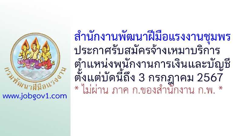 สำนักงานพัฒนาฝีมือแรงงานชุมพร รับสมัครจ้างเหมาบริการ ตำแหน่งพนักงานการเงินและบัญชี ตั้งแต่บัดนี้ถึง 3 กรกฎาคม 2567