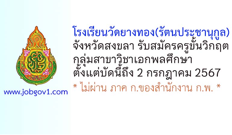 โรงเรียนวัดยางทอง(รัตนประชานุกูล) รับสมัครครูขั้นวิกฤต สาขาวิชาเอกพลศึกษา ตั้งแต่บัดนี้ถึง 2 กรกฎาคม 2567