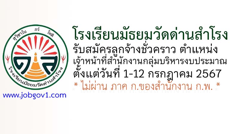 โรงเรียนมัธยมวัดด่านสำโรง รับสมัครลูกจ้างชั่วคราว ตำแหน่งเจ้าหน้าที่สำนักงานกลุ่มบริหารงบประมาณ ตั้งแต่วันที่ 1-12 กรกฎาคม 2567