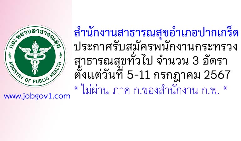 สำนักงานสาธารณสุขอำเภอปากเกร็ด รับสมัครพนักงานกระทรวงสาธารณสุขทั่วไป 3 อัตรา ตั้งแต่วันที่ 5-11 กรกฎาคม 2567