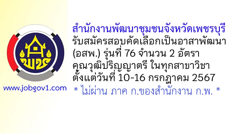 สำนักงานพัฒนาชุมชนจังหวัดเพชรบุรี รับสมัครสอบคัดเลือกเป็นอาสาพัฒนา (อสพ.) รุ่นที่ 76 จำนวน 2 อัตรา ตั้งแต่วันที่ 10-16 กรกฎาคม 2567