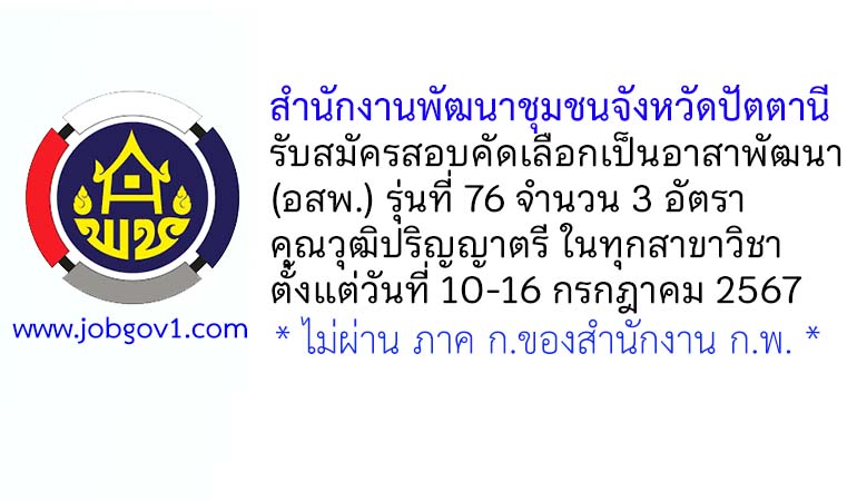 สำนักงานพัฒนาชุมชนจังหวัดปัตตานี รับสมัครสอบคัดเลือกเป็นอาสาพัฒนา (อสพ.) รุ่นที่ 76 จำนวน 3 อัตรา ตั้งแต่วันที่ 10-16 กรกฎาคม 2567