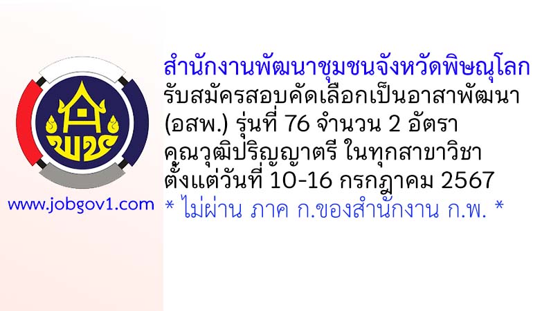 สำนักงานพัฒนาชุมชนจังหวัดพิษณุโลก รับสมัครสอบคัดเลือกเป็นอาสาพัฒนา (อสพ.) รุ่นที่ 76 จำนวน 2 อัตรา ตั้งแต่วันที่ 10-16 กรกฎาคม 2567