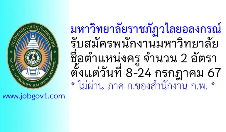 มหาวิทยาลัยราชภัฏวไลยอลงกรณ์ รับสมัครพนักงานมหาวิทยาลัย ตำแหน่งครู จำนวน 2 อัตรา ตั้งแต่วันที่ 8-24 กรกฎาคม 2567