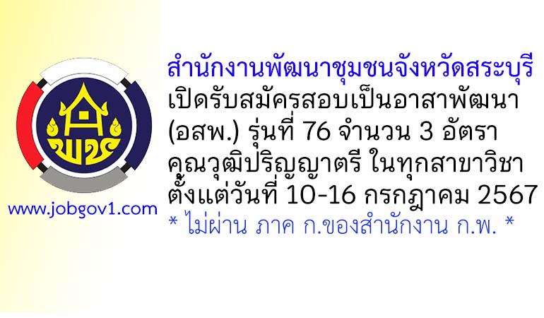 สำนักงานพัฒนาชุมชนจังหวัดสระบุรี รับสมัครสอบคัดเลือกเป็นอาสาพัฒนา (อสพ.) รุ่นที่ 76 จำนวน 3 อัตรา ตั้งแต่วันที่ 10-16 กรกฎาคม 2567