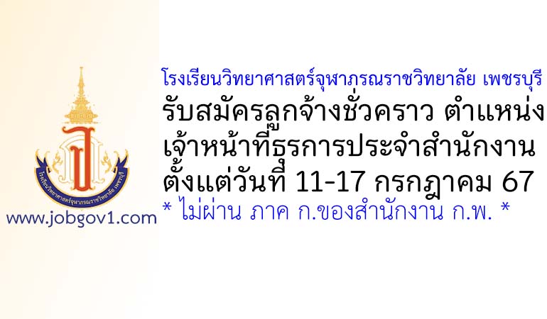 โรงเรียนวิทยาศาสตร์จุฬาภรณราชวิทยาลัย เพชรบุรี รับสมัครลูกจ้างชั่วคราว ตำแหน่งเจ้าหน้าที่ธุรการประจำสำนักงาน ตั้งแต่วันที่ 11-17 กรกฎาคม 2567
