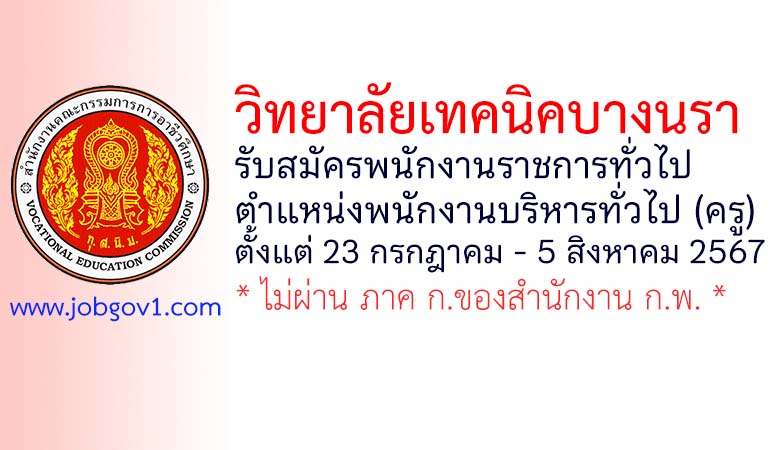 วิทยาลัยเทคนิคบางนรา รับสมัครพนักงานราชการทั่วไป ตำแหน่งพนักงานบริหารทั่วไป (ครู) ตั้งแต่ 23 กรกฎาคม – 5 สิงหาคม 2567