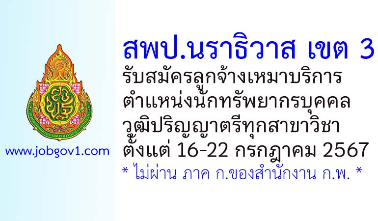 สพป.นราธิวาส เขต 3 รับสมัครลูกจ้างเหมาบริการ ตำแหน่งนักทรัพยากรบุคคล ตั้งแต่วันที่ 16-22 กรกฎาคม 2567