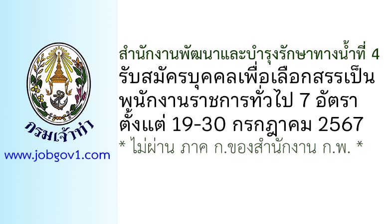 สำนักงานพัฒนาและบำรุงรักษาทางน้ำที่ 4 รับสมัครบุคคลเพื่อเลือกสรรเป็นพนักงานราชการทั่วไป 7 อัตรา ตั้งแต่วันที่ 19-30 กรกฎาคม 2567