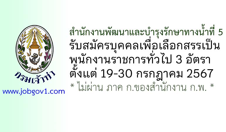 สำนักงานพัฒนาและบำรุงรักษาทางน้ำที่ 5 รับสมัครบุคคลเพื่อเลือกสรรเป็นพนักงานราชการทั่วไป 3 อัตรา ตั้งแต่วันที่ 19-30 กรกฎาคม 2567