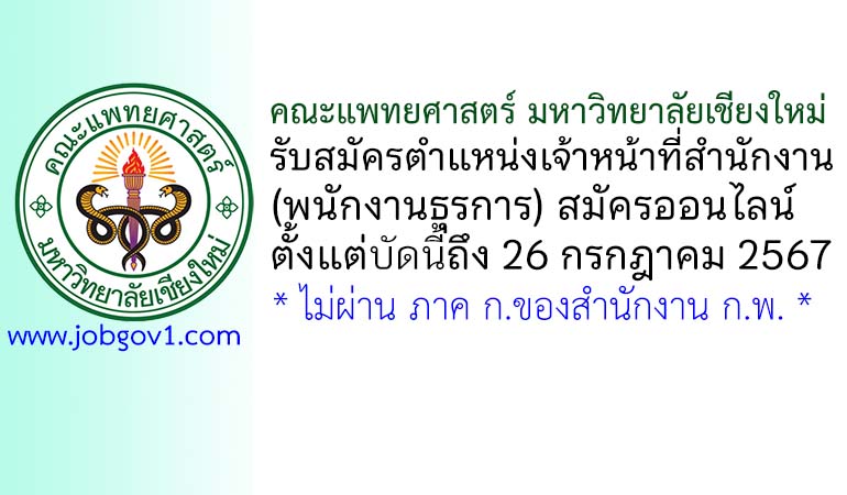 คณะแพทยศาสตร์ มหาวิทยาลัยเชียงใหม่ รับสมัครเจ้าหน้าที่สำนักงาน (พนักงานธุรการ) ตั้งแต่บัดนี้ถึง 26 กรกฎาคม 2567