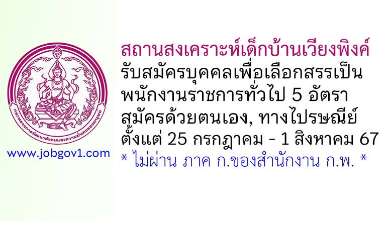 สถานสงเคราะห์เด็กบ้านเวียงพิงค์ รับสมัครบุคคลเพื่อเลือกสรรเป็นพนักงานราชการทั่วไป 5 อัตรา ตั้งแต่ 25 กรกฎาคม – 1 สิงหาคม 2567