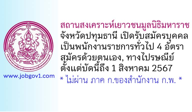 สถานสงเคราะห์เยาวชนมูลนิธิมหาราช จังหวัดปทุมธานี รับสมัครบุคคลเพื่อเลือกสรรเป็นพนักงานราชการทั่วไป 4 อัตรา ตั้งแต่บัดนี้ถึง 1 สิงหาคม 2567