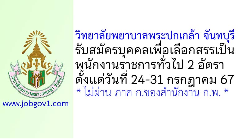 วิทยาลัยพยาบาลพระปกเกล้า จันทบุรี รับสมัครบุคคลเพื่อเลือกสรรเป็นพนักงานราชการทั่วไป 2 อัตรา ตั้งแต่วันที่ 24-31 กรกฎาคม 2567