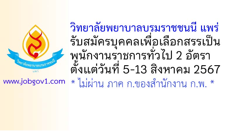 วิทยาลัยพยาบาลบรมราชชนนี แพร่ รับสมัครบุคคลเพื่อเลือกสรรเป็นพนักงานราชการทั่วไป 2 อัตรา ตั้งแต่วันที่ 5-13 สิงหาคม 2567