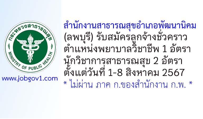 สำนักงานสาธารณสุขอำเภอพัฒนานิคม รับสมัครลูกจ้างชั่วคราว 3 อัตรา ตั้งแต่วันที่ 1-8 สิงหาคม 2567