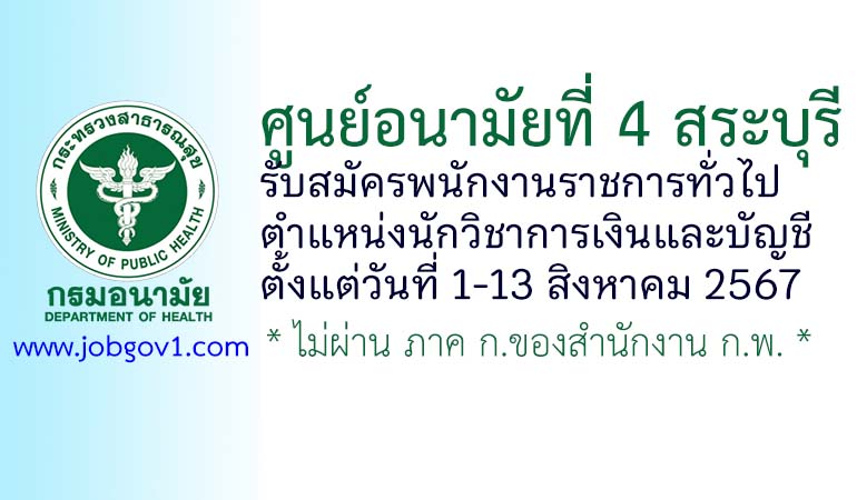 ศูนย์อนามัยที่ 4 สระบุรี รับสมัครพนักงานราชการทั่วไป ตำแหน่งนักวิชาการเงินและบัญชี ตั้งแต่วันที่ 1-13 สิงหาคม 2567