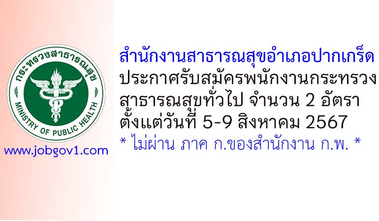 สำนักงานสาธารณสุขอำเภอปากเกร็ด รับสมัครพนักงานกระทรวงสาธารณสุขทั่วไป 2 อัตรา ตั้งแต่วันที่ 5-9 สิงหาคม 2567