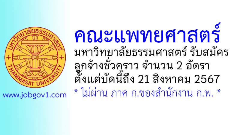 คณะแพทยศาสตร์ มหาวิทยาลัยธรรมศาสตร์ รับสมัครลูกจ้างชั่วคราว 2 อัตรา ตั้งแต่บัดนี้ถึง 21 สิงหาคม 2567