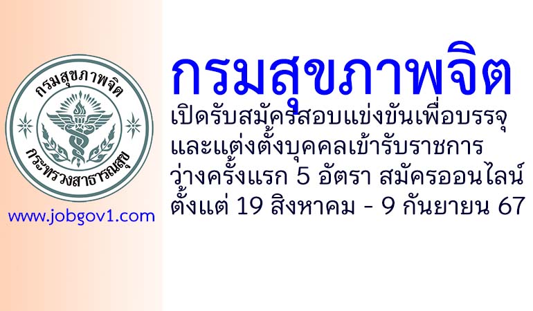 กรมสุขภาพจิต รับสมัครสอบแข่งขันเพื่อบรรจุและแต่งตั้งบุคคลเข้ารับราชการ ว่างครั้งแรก 5 อัตรา ตั้งแต่ 19 สิงหาคม – 9 กันยายน 2567