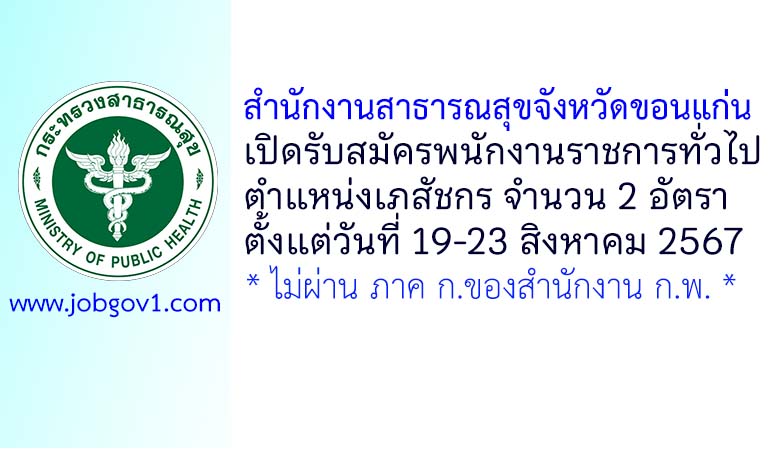 สำนักงานสาธารณสุขจังหวัดขอนแก่น รับสมัครพนักงานราชการทั่วไป ตำแหน่งเภสัชกร จำนวน 2 อัตรา ตั้งแต่วันที่ 19-23 สิงหาคม 2567