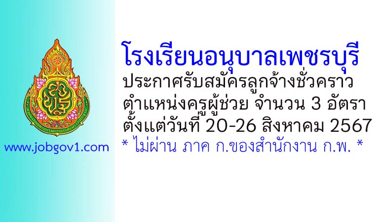 โรงเรียนอนุบาลเพชรบุรี รับสมัครลูกจ้างชั่วคราว ตำแหน่งครูผู้ช่วย 3 อัตรา ตั้งแต่วันที่ 20-26 สิงหาคม 2567