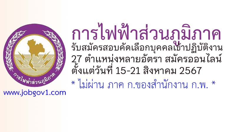 การไฟฟ้าส่วนภูมิภาค (กฟภ.) รับสมัครสอบคัดเลือกบุคคลเข้าปฏิบัติงาน 27 ตำแหน่งหลายอัตรา ตั้งแต่วันที่ 15-21 สิงหาคม 2567