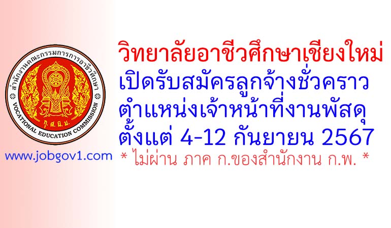 วิทยาลัยอาชีวศึกษาเชียงใหม่ รับสมัครลูกจ้างชั่วคราว ตำแหน่งเจ้าหน้าที่งานพัสดุ ตั้งแต่วันที่ 4-12 กันยายน 2567