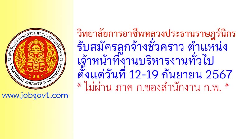 วิทยาลัยการอาชีพหลวงประธานราษฎร์นิกร รับสมัครลูกจ้างชั่วคราว ตำแหน่งเจ้าหน้าที่งานบริหารงานทั่วไป ตั้งแต่วันที่ 12-19 กันยายน 2567