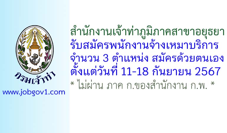 สำนักงานเจ้าท่าภูมิภาคสาขาอยุธยา รับสมัครพนักงานจ้างเหมาบริการเอกชน 3 ตำแหน่ง ตั้งแต่วันที่ 11-18 กันยายน 2567