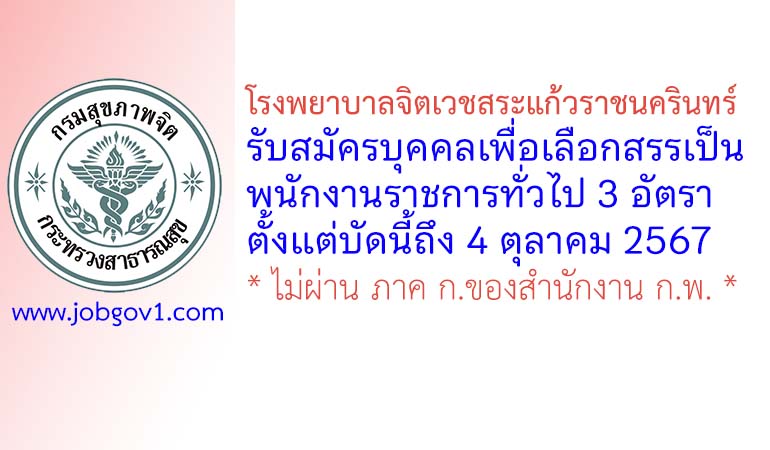 โรงพยาบาลจิตเวชสระแก้วราชนครินทร์ รับสมัครบุคคลเพื่อเลือกสรรเป็นพนักงานราชการทั่วไป 3 อัตรา ตั้งแต่บัดนี้ถึง 4 ตุลาคม 2567