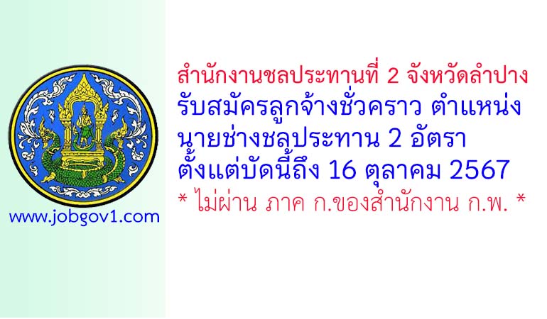 สำนักงานชลประทานที่ 2 จังหวัดลำปาง รับสมัครลูกจ้างชั่วคราว ตำแหน่งนายช่างชลประทาน 2 อัตรา ตั้งแต่บัดนี้ถึง 16 ตุลาคม 2567