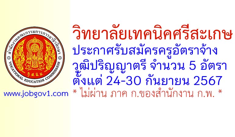 วิทยาลัยเทคนิคศรีสะเกษ รับสมัครครูอัตราจ้าง 5 อัตรา ตั้งแต่วันที่ 24-30 กันยายน 2567