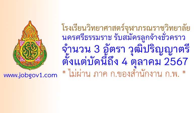 โรงเรียนวิทยาศาสตร์จุฬาภรณราชวิทยาลัย นครศรีธรรมราช รับสมัครลูกจ้างชั่วคราว 3 อัตรา ตั้งแต่บัดนี้ถึง 4 ตุลาคม 2567