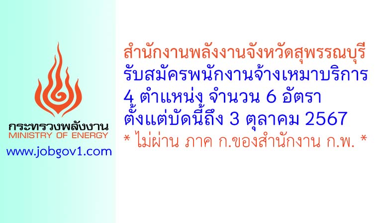 สำนักงานพลังงานจังหวัดสุพรรณบุรี รับสมัครพนักงานจ้างเหมาบริการ 6 อัตรา ตั้งแต่บัดนี้ถึง 3 ตุลาคม 2567