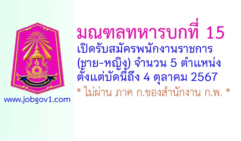มณฑลทหารบกที่ 15 รับสมัครพนักงานราชการ (ชาย-หญิง) 5 ตำแหน่ง ตั้งแต่บัดนี้ถึง 4 ตุลาคม 2567