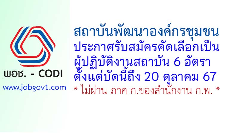 สถาบันพัฒนาองค์กรชุมชน (องค์การมหาชน) รับสมัครคัดเลือกบุคคลทั่วไปเพื่อเป็นผู้ปฏิบัติงานสถาบัน 6 อัตรา ตั้งแต่บัดนี้ถึง 20 ตุลาคม 2567
