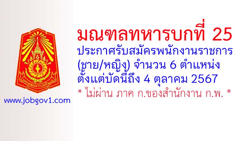 มณฑลทหารบกที่ 25 รับสมัครพนักงานราชการ (ชาย/หญิง) 6 ตำแหน่ง ตั้งแต่บัดนี้ถึง 4 ตุลาคม 2567