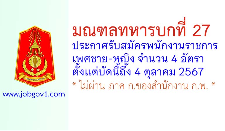 มณฑลทหารบกที่ 27 รับสมัครพนักงานราชการ (ชาย/หญิง) 4 อัตรา ตั้งแต่บัดนี้ถึง 4 ตุลาคม 2567