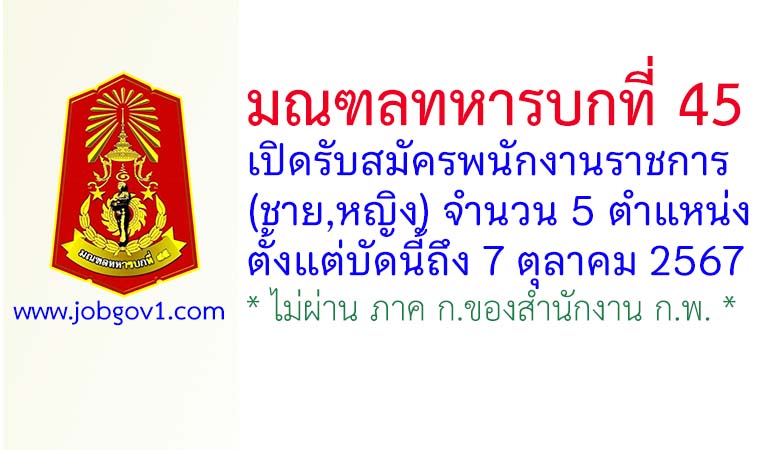 มณฑลทหารบกที่ 45 รับสมัครพนักงานราชการ (ชาย/หญิง) 5 ตำแหน่ง ตั้งแต่บัดนี้ถึง 7 ตุลาคม 2567