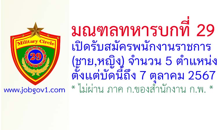 มณฑลทหารบกที่ 29 รับสมัครพนักงานราชการ (ชาย/หญิง) 5 ตำแหน่ง ตั้งแต่วันที่ 1-7 ตุลาคม 2567