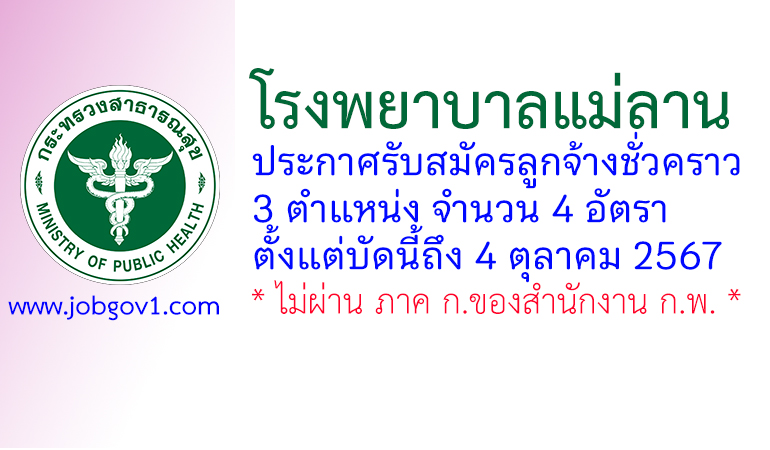 โรงพยาบาลแม่ลาน รับสมัครลูกจ้างชั่วคราว 4 อัตรา ตั้งแต่บัดนี้ถึง 4 ตุลาคม 2567