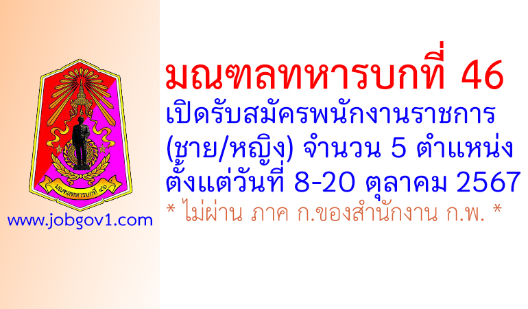 มณฑลทหารบกที่ 46 รับสมัครพนักงานราชการ (ชาย/หญิง) 5 ตำแหน่ง ตั้งแต่วันที่ 8-20 ตุลาคม 2567