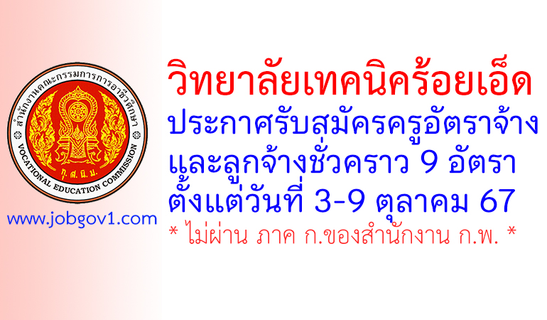 วิทยาลัยเทคนิคร้อยเอ็ด รับสมัครครูอัตราจ้าง และลูกจ้างชั่วคราว 9 อัตรา ตั้งแต่วันที่ 3-9 ตุลาคม 2567