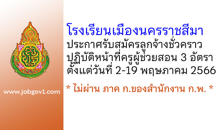 โรงเรียนเมืองนครราชสีมา รับสมัครลูกจ้างชั่วคราว ปฏิบัติหน้าที่ครูผู้ช่วยสอน 3 อัตรา ตั้งแต่วันที่ 2-19 พฤษภาคม 2566