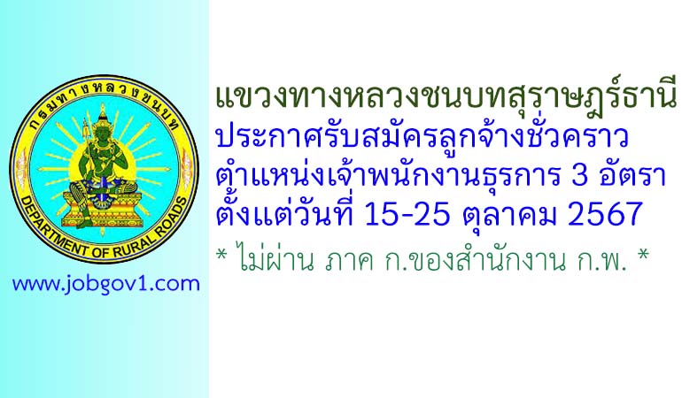 แขวงทางหลวงชนบทสุราษฎร์ธานี รับสมัครลูกจ้างชั่วคราว ตำแหน่งเจ้าพนักงานธุรการ 3 อัตรา ตั้งแต่วันที่ 15-25 ตุลาคม 2567