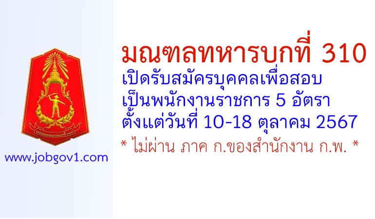มณฑลทหารบกที่ 310 รับสมัครบุคคลเพื่อสอบเป็นพนักงานราชการ 5 อัตรา ตั้งแต่วันที่ 10-18 ตุลาคม 2567