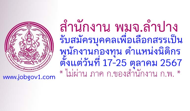 สำนักงาน พมจ.ลำปาง รับสมัครบุคคลเพื่อเลือกสรรเป็นพนักงานกองทุน ตำแหน่งนิติกร ตั้งแต่วันที่ 17-25 ตุลาคม 2567