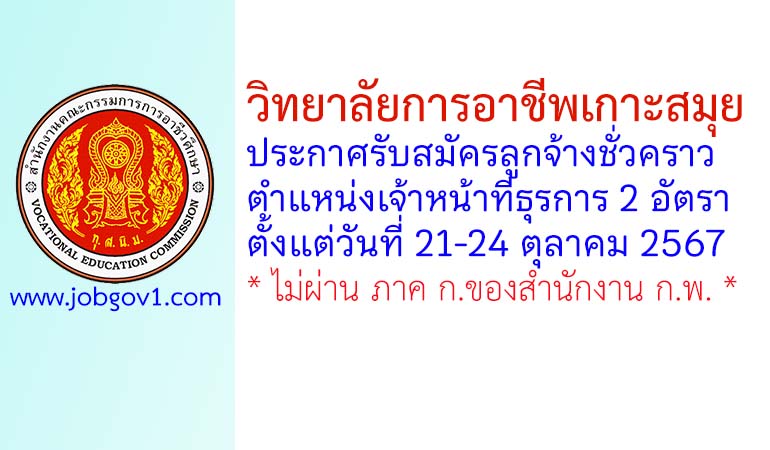 วิทยาลัยการอาชีพเกาะสมุย รับสมัครลูกจ้างชั่วคราว ตำแหน่งเจ้าหน้าที่ธุรการ 2 อัตรา ตั้งแต่วันที่ 21-24 ตุลาคม 2567